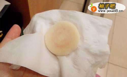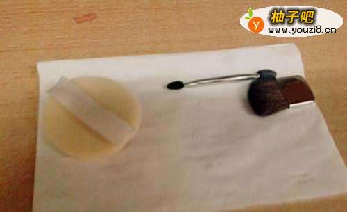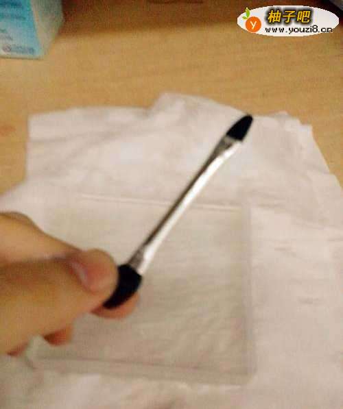 3用卫生纸擦净眼影棒、粉扑和粉刷上混着残粉的化妆水