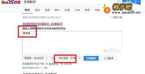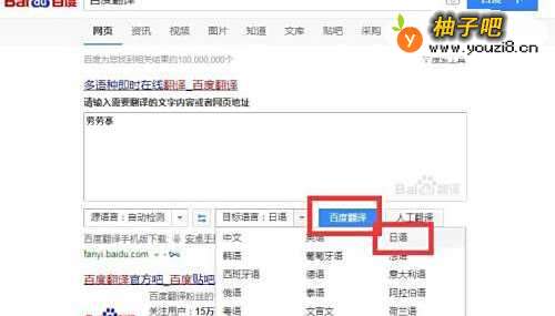 5然后点击“目标语言”,选择“日语”,接着点击“百度翻译”,如图