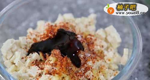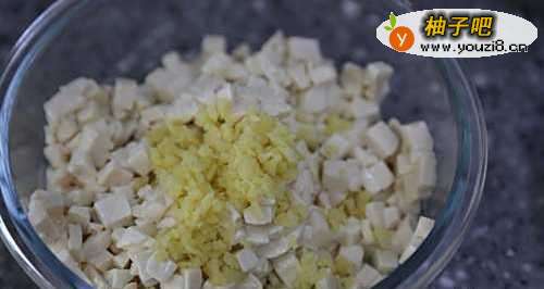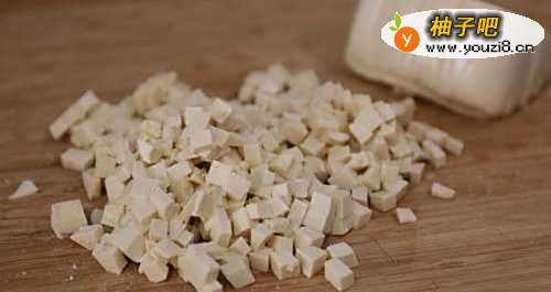 7煮好的豆腐丁沥干水分放入一个大点的容器内。