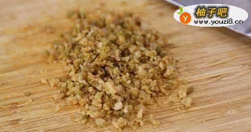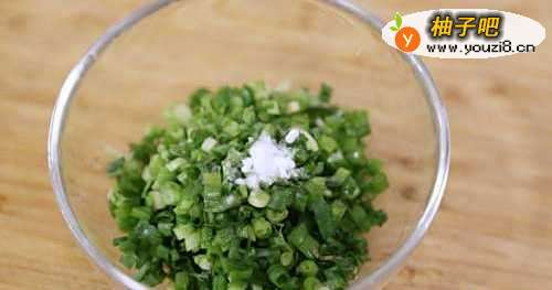 4葱洗净擦掉水分,切成这样的碎沫状。葱里面我也放了一些小苏打,是为了颜色更好看没有可以忽略哦。