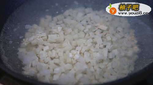 6锅里_上水烧开,加入切好的豆腐丁少许盐,这样是为了去除豆腐的豆腥味儿。
