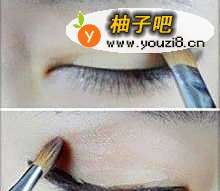 眼影刷蘸取适量的橘色眼影,把它涂抹在眼窝的位置,为眼部打底。接下来换上棕色的眼影,对眼尾部分进行晕染,强调眼尾的深邃感觉。最后的一个步骤是使用咖啡色的眼影叠加在眼线的位置,加深眼线,稍加晕染,让它能够跟眼妆相配合。