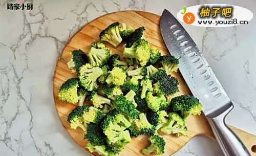 西兰花洗净后,切成大小差不多的样子。挑选西兰花时要注意挑选颜色都是特别浓绿的,花球是不是紧紧抱在一起?如果是紧紧抱在一起的说明这个西兰花的口感会非常好,吃起来清脆又鲜嫩;如果是花蕊非常松散说明这个西兰花已经老了。