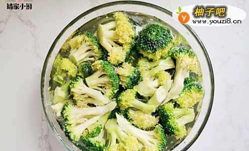 2切好的西兰花先用淡盐水浸泡10分钟,这样不但可以去除菜虫,还有助于去除残留农药。