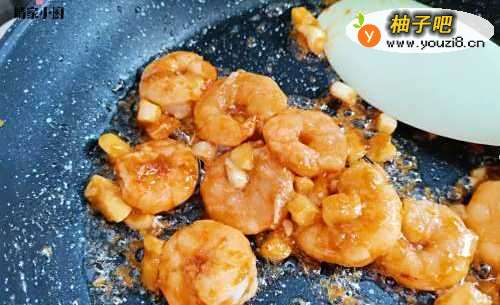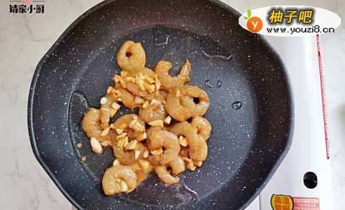 7热锅,放适量凉油,将腌制好的虾仁和蒜一起倒入锅中。