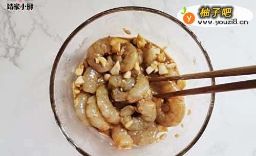 4鲜虾仁洗净去虾线。处理好的鲜虾仁放入生抽,干淀粉和蒜末,抓匀,腌制10分钟。