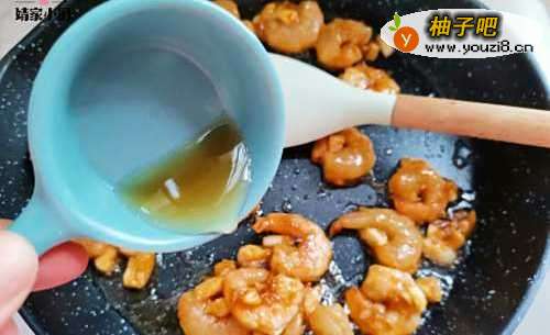 8将虾仁炒至半熟,半透明的状态,倒入料酒。