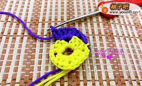 4第三圈:换上紫色的线先立3个辫子针,在第一个洞洞里钩2个长针,钩1个辫子针,再钩3个长针,如图所示;