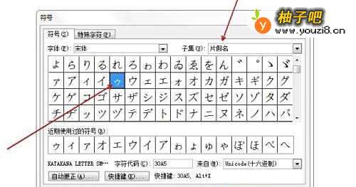 4在“子集”中选择“片假名”,并在下方选中片假名ゥ,点击“插入”。