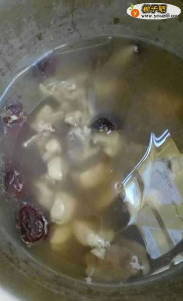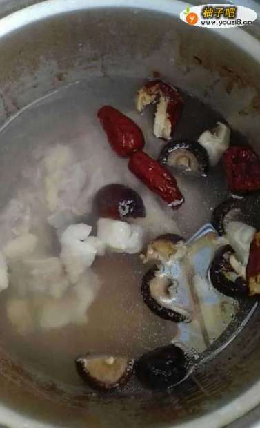 6蘑菇鸡汤,红枣、蘑菇、鸡肉洗净,放入锅中,加水煮30分钟