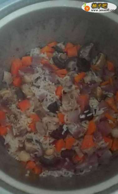 9鸡肉饭、洋葱、胡萝卜、蘑菇、鸡肉、米饭,洗净放入锅中,开始烹饪30分钟。