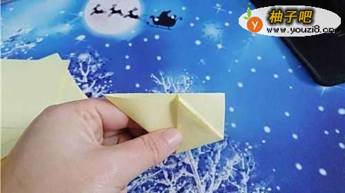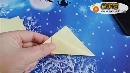 3把上面的角向下折进彩纸里,然后再把左侧的角向右折,如图所示。