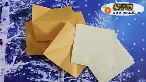 首先准备好八张正方形的彩纸,先把彩纸的两角对折,如图。