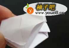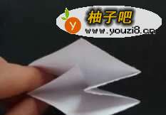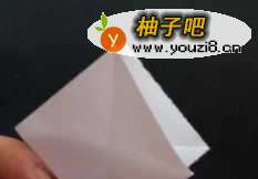 6再翻折一下,将下面的角往里折,尽量折整齐。同理,那一面也如此。接着打开,一个小盒子就完了啦。最后可以用长条状的纸贴在盒子两边,当手提绳。