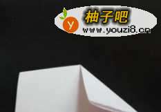 3用手指从中间往两边打开,注意对整齐,压一下,压出痕迹。将上面的角从中间翻折下来。同样将纸翻过来,同样的将上面的角折下来。