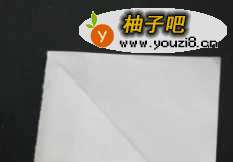 2再左右对折一下,沿着对折的中线印记将这个角折下来。将纸翻一面,同样的步骤折下另一个角,注意两个角不是在一边的哟,看图就知道了。