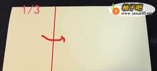 2上图对折后的效果参见下图所示。然后把折叠后的长方形彩纸,等分成三份。图中画竖线的位置,就是三分之一处。沿着竖线的位置,把左边向右折叠起来。