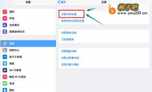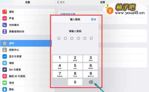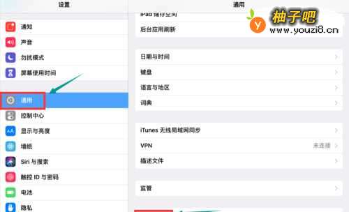 2点开iPad的设置界面,点击通用图标,右侧点击选择还原图标。