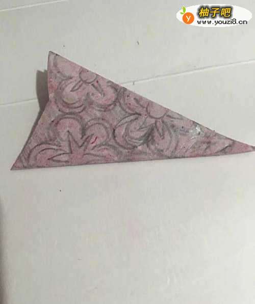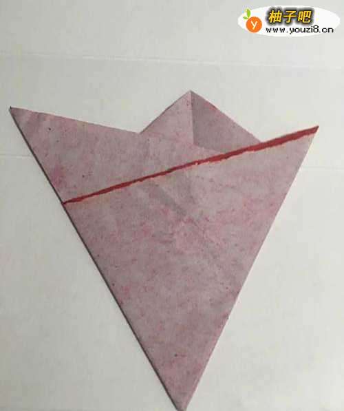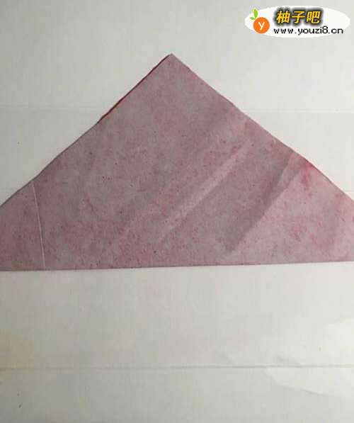 第一步 首先把一张16厘米X16厘米的正方形红色彩纸 从下向上对角折叠整齐