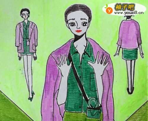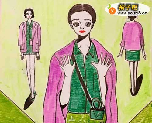 3用笔画出人物的服装和包包。我们用笔画出第三个女郎的背影。薰衣草紫色马克笔为人物的大衣上色,深绿色马克笔为服装和包包上色。