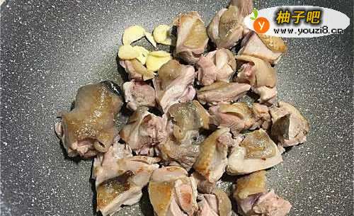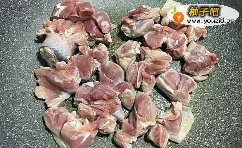 锅里放一大匙油,放入切块的鸡腿,中火将鸡肉表面煎熟。