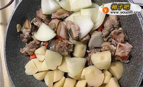 3再放入切块的洋葱、马铃薯、红萝卜,翻炒至洋葱稍微变透明。