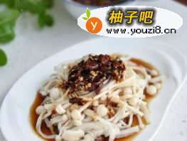 8把调好的料汁浇在金针菇上,拌匀即可。