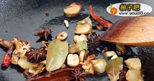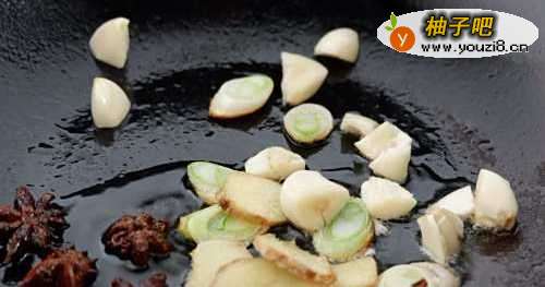 4油锅放入葱姜蒜八角桂皮,翻炒