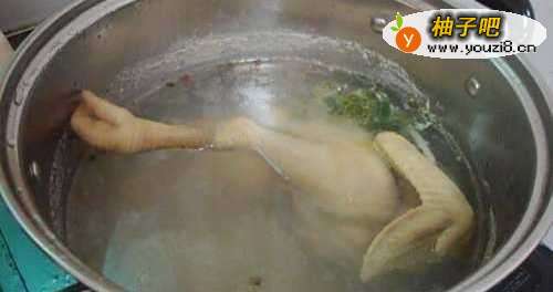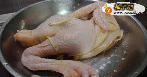 将鸡冷水下锅,水开后10分钟,关火盖上盖继续焖10分钟后,捞出放入冰水中浸泡10分钟