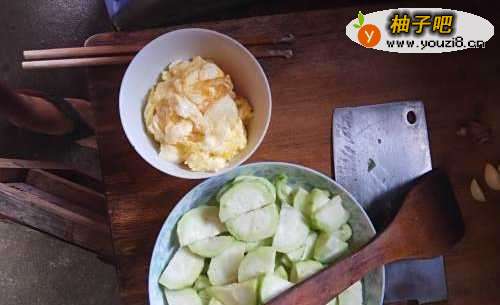 准备步骤:取一根丝瓜洗压蕉率净、去皮,讨宿切成片。准备2个辣椒,两片蒜瓣,切好。取两个生鸡蛋,打出,调匀。