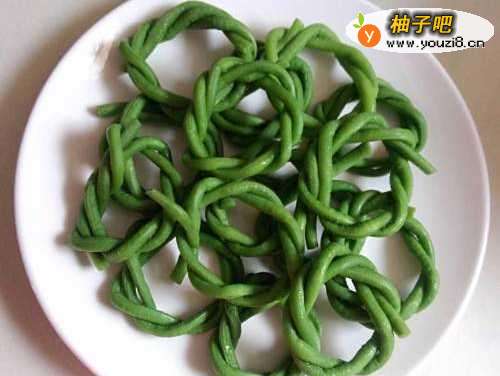 4沥干水分的豆角,取一根编成圆环状,首尾相连,就像打结那样,打成一个个圆圈即可。
