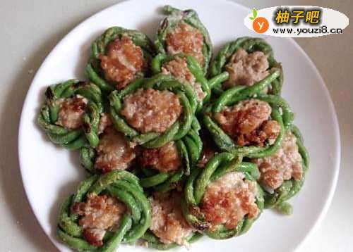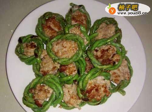 6接着将和好的肉馅塞到豆角中间,依次塞满即可。