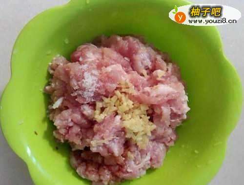 2切好的肉沫放在碗里,再加入姜蓉和蒜末、盐和一点酱油搅拌均匀备用。
