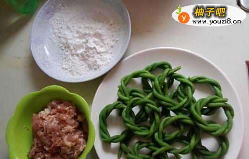 5所有的材料都准备好之后,在一个盘子里倒50克干淀粉,把编好的豆角圈沾满淀粉,