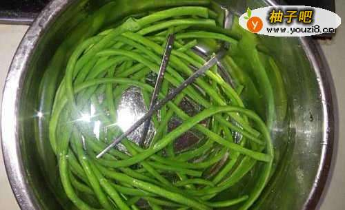 3豆角去头去尾,不用切断,锅内放水,水开之后,豆角焯1分钟捞出放在凉水里后沥干备用。