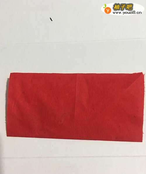 第一步 首先把一张8厘米X8厘米的正方形红色彩纸 从下向上对边折叠 然后再从右向左对边折叠