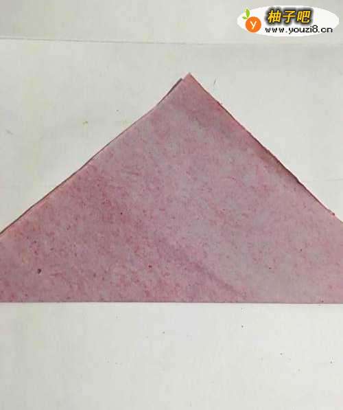 第一步 首先把一张15厘米X15厘米的红色正方形彩纸 从下向上对角折叠整齐