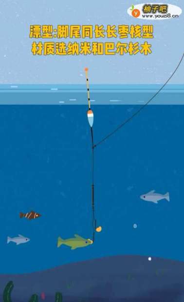 3浮漂水深选大些,水浅用小些,漂型选择脚尾同长长枣核型,材质选纳米和巴尔杉木,吃铅量根据竿长而定,一般选1~1.7克之间