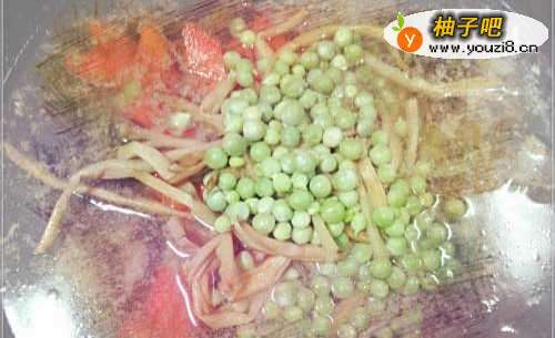 干山药用开水泡软,滤干;胡萝卜切片;豌豆剥壳,洗净;干黄花泡软,滤干备用。