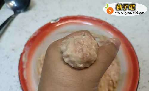 5锅里加入适量食用油,油温烧至五成热左右,把火力转为中火,取一团肉馅在手中,用虎口挤出丸子状,然后用小勺子剥下来,下入油锅中。