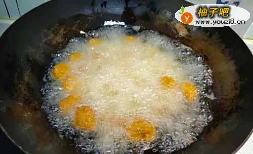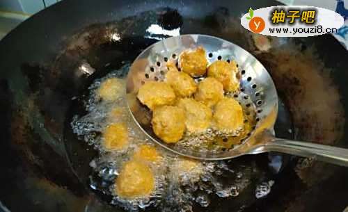 7丸子全部炸好以后,再把锅里的油温升高到七成热,把丸子全部下锅复炸一遍,复炸的时间在15秒左右,炸至表皮酥脆后捞出控油。