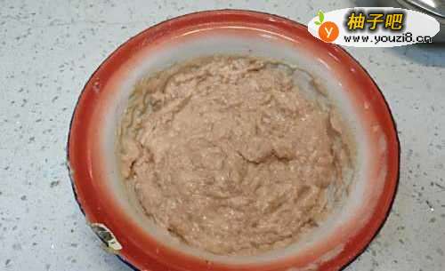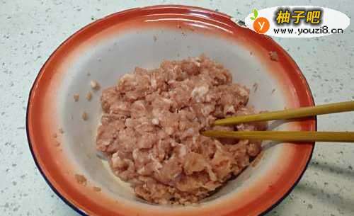 2把后腿肉洗净去皮,先切成小块,然后再剁成肉末,放在盆中,加入适量盐搅拌均匀,让肉馅吸收盐分。
