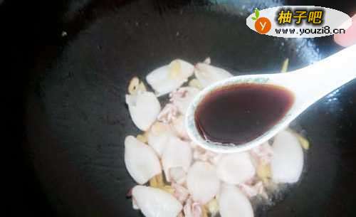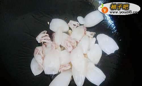 5:放入沥干水份的小管鱿鱼,大火煸炒至肉质微缩。
