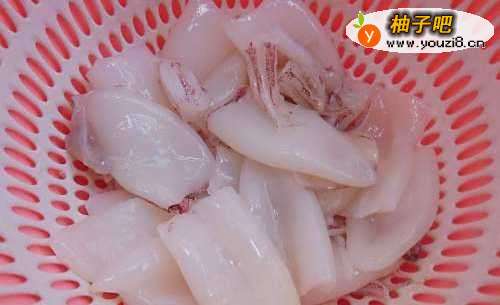 小管鱿鱼去掉软骨和内脏,在流水下冲洗干净,沥干水份备用。