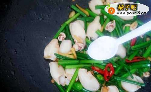 7放入韭菜花和红辣椒,与小管一同大火急炒。