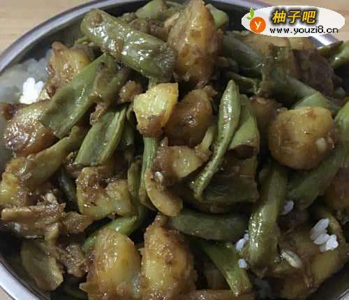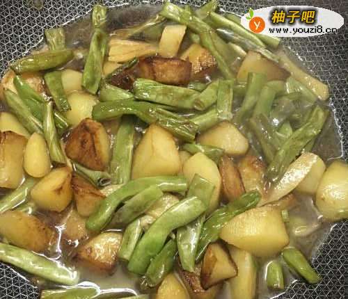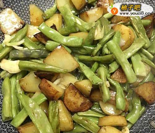 5然后放入炸好的土豆、四季豆,翻炒均匀。