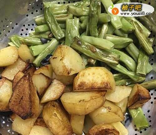 2然后分别把四季豆和土豆中大火炸5分钟,四季豆炸出褶皱,土豆炸得表面焦黄。
