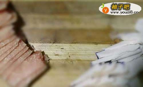 4猪肉肥瘦分开,切片。(荤素要分开处理,用两个案板)
