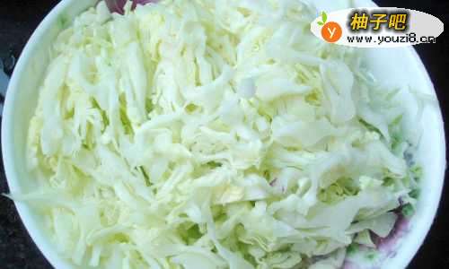 首先把圆白菜切丝,撕的圆白菜不便于成熟,切丝会很快的熟,大概切一厘米粗,不要切太细,八九厘米长就行