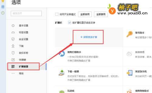 3接下来点击页面左侧的“扩展管理”选项卡,然后点击“获取更多扩展”。